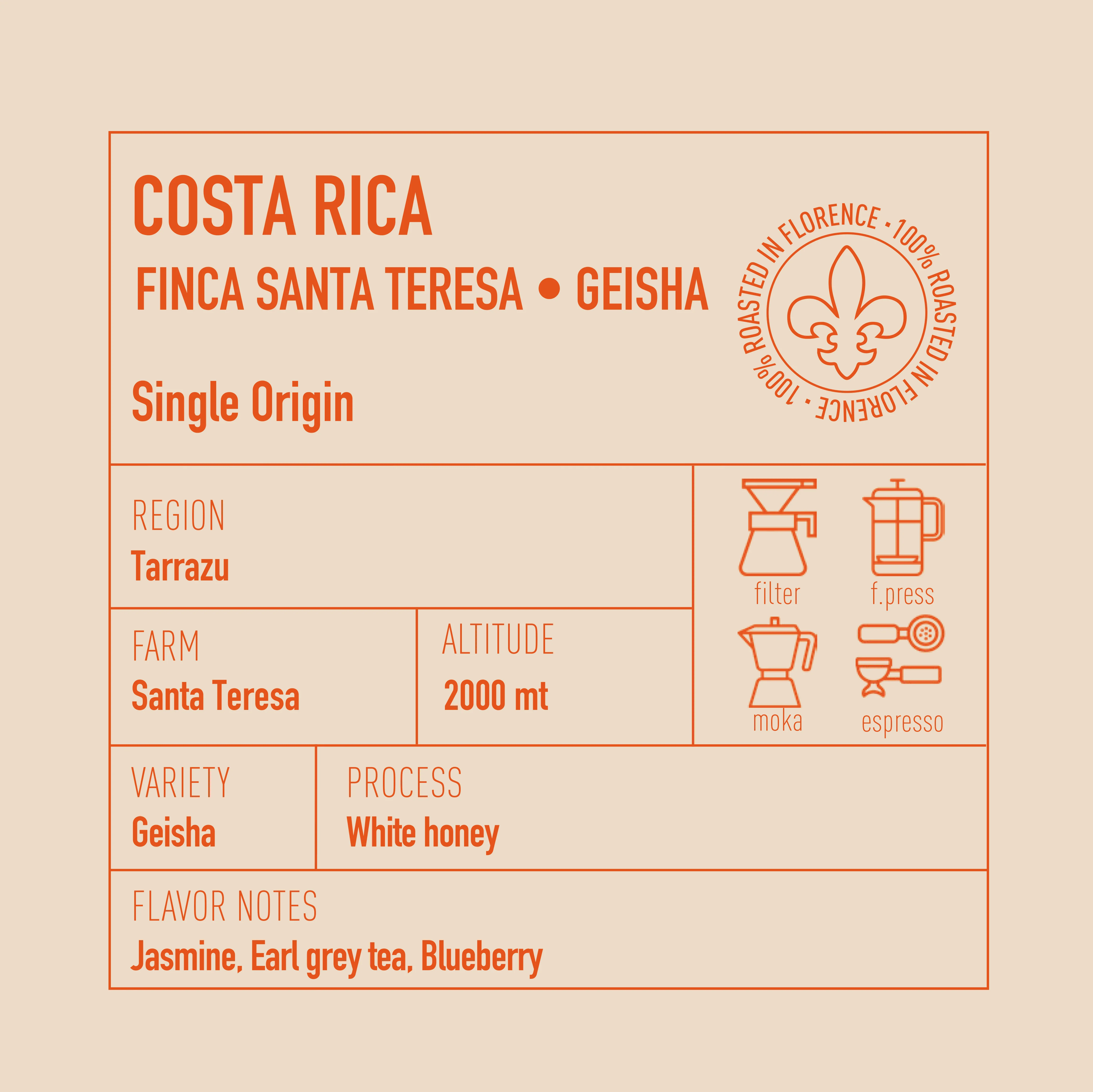 Dalle montagne di Tarrazú, a 2000 metri sul livello del mare, nasce Finca Santa Teresa, un caffè specialty single origin che esprime tutta l’eleganza e la complessità della varietà Geisha.