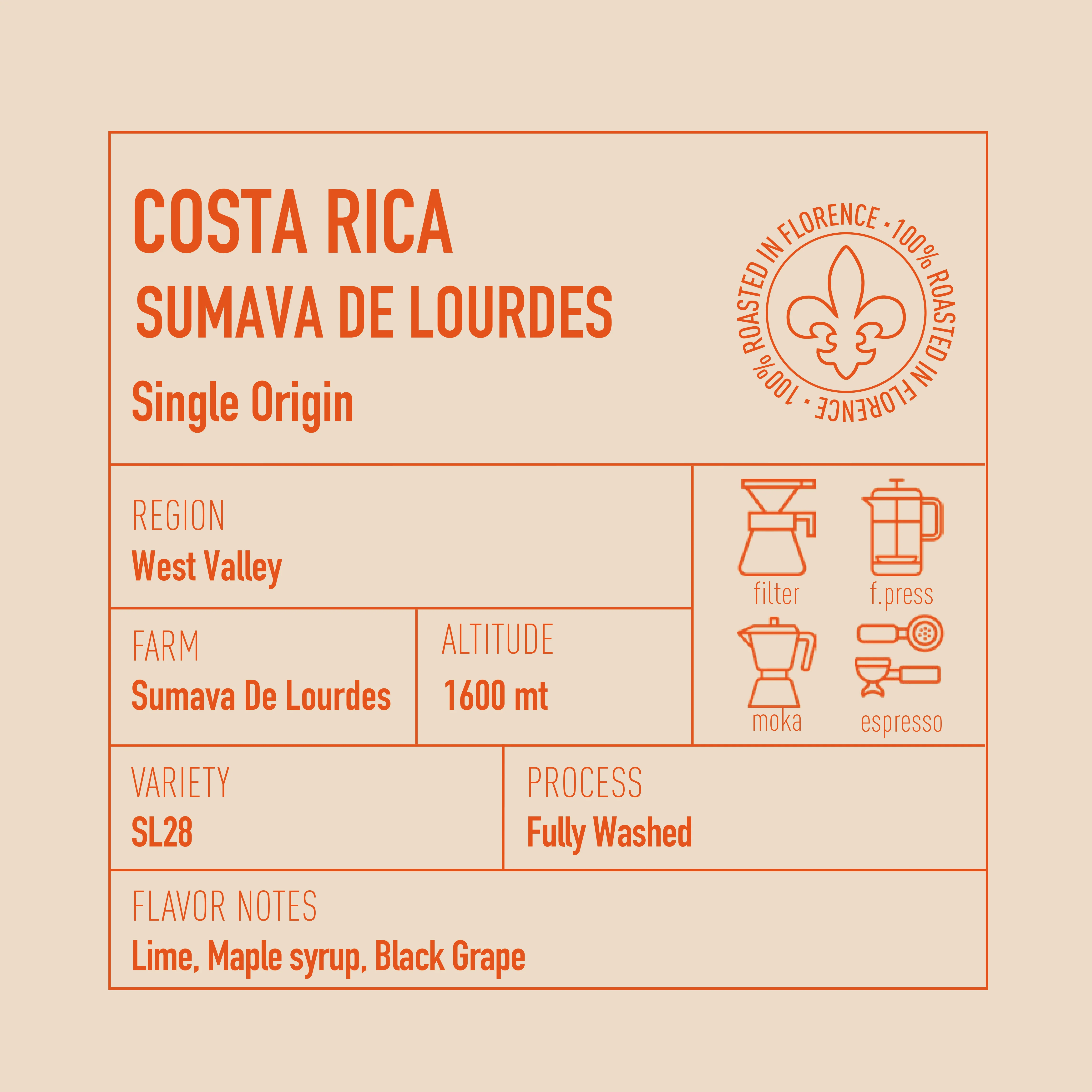 Questo caffè monorigine proviene dalla prestigiosa finca Sumava de Lourdes, situata nella regione del West Valley in Costa Rica, un’area rinomata per l'altitudine ideale e per le sue condizioni pedoclimatiche uniche. Coltivato a 1600 metri, questo lotto della varietà SL28 viene lavorato con processo fully washed, che mette in evidenza la pulizia e la brillantezza del profilo aromatico.